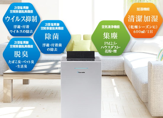 さらに、加湿機能を加えた5つの役割を持つ、これが〔世界・新基準〕“ 次亜塩素酸 空気清浄機”「Viruswasher®︎(ウイルスウォッシャー®︎)」です。