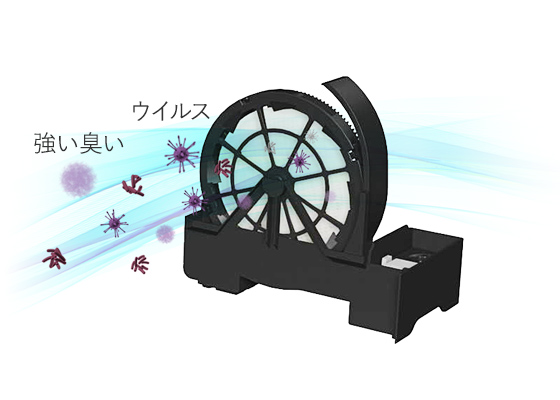 高性能HEPAフィルターを含む三重構造フィルターで空気清浄化を行い、キレイになった空気を除菌水フィルター(通風型)に透過させます。 -